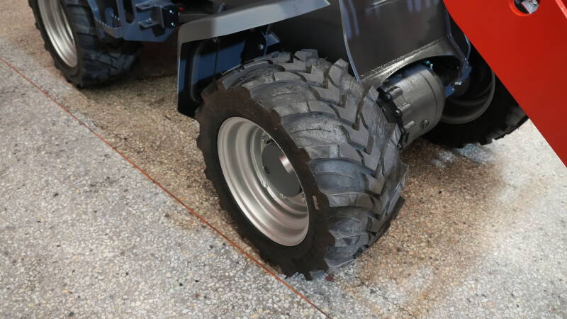 Die Maschine verfügt über zwei angetriebene Achsen. In Kombination mit zuschaltbaren Differentialsperren und integrierten Nassbremsachsen ist das Antriebssystem für den Einsatz unter unterschiedlichen Untergrundbedingungen vorgesehen.