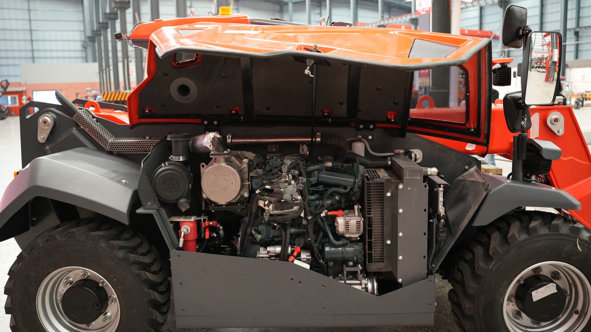 Wartungsrelevante Baugruppen wie Motor, Filtereinheiten, Hydraulik- und Kühlsystemkomponenten sind Bestandteil der serienmäßigen Maschinenkonfiguration.